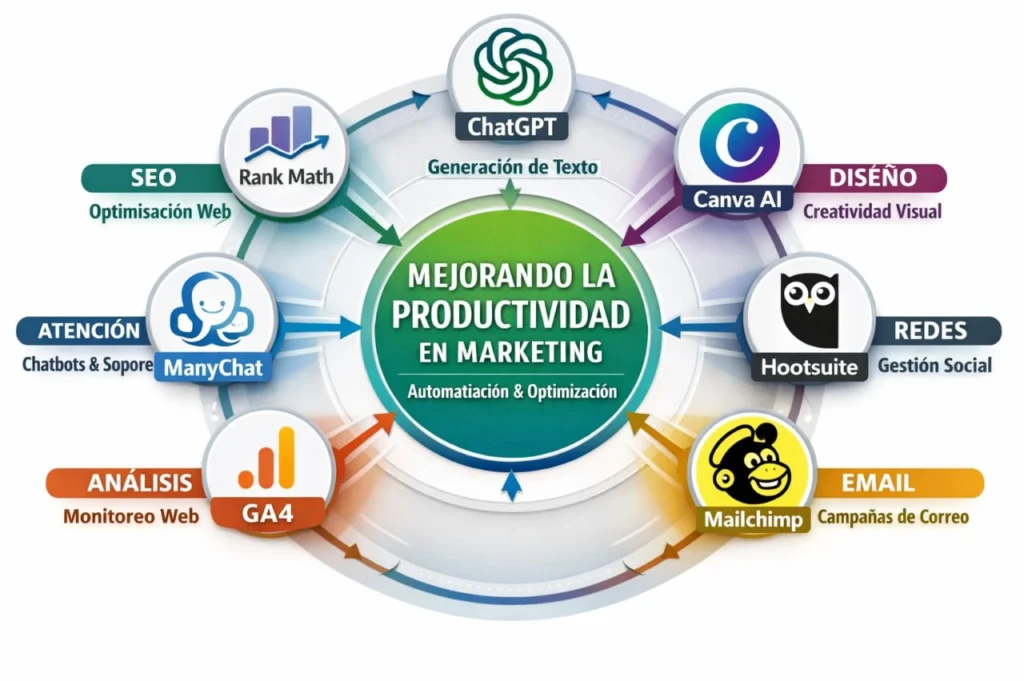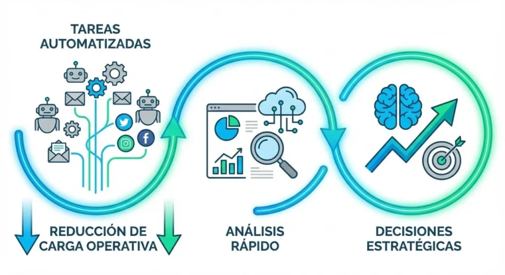 La implementación de herramientas AI para marketing reduce drásticamente las tareas repetitivas. Actividades como redacción, programación, análisis y atención al cliente pasan a ejecutarse de forma automática, permitiendo al emprendedor enfocarse en decisiones estratégicas que generan crecimiento real.